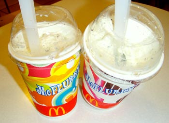 このマックフルーリーとは、ソフトクリームに、クラッシュされたオレオクッキーやキットカットをトッピング。それを専用マシーンとオリジナルスプーンで高速で混ぜ合わせた新食感デザート。全世界で20以上の国と地域で発売されている人気メニューとのこと。今年4/20から、東京・大阪・名古屋エリアなどで本格展開。その人気も一気に拡大した。特に「オレオ」が人気だ。 「ソフトクリームがなめらか」で「甘すぎず」「コクがあって」、「オレオのサクサク感がマッチ」。その「相性が抜群」!「ココアクッキーの苦味と、ソフトクリームの甘さが絶妙で」「絶妙なハーモニーをかもしだていてたまらなくおいしい」! 「完成度の高いデザート」。「最高に美味しい」!「ほっぺたがおちるくらいおいしい!!」「ファーストフード店に全く興味なかったが、フルーリーだけが目的で何度も足を運んでいる」という人までいるほど。 最近では、プレミアムフルーリーと称し、さらに「ストロベリー」や「キャラメル」をトッピングした商品が期間限定で発売され、オススメでも好評だ。「食べ終わった後ではおいしさのあまり、値段のことなんて忘れています」というだけあって、今年の夏は¥100のマックシェイクは「オススメ」では影をひそめてしまったようだ・・・。 | ||