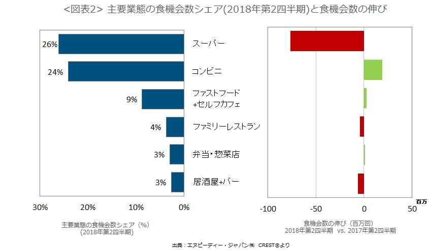 業態別の食機会数の成長率(図表2)をみてみると、全体の26%を占めるシェア1位のスーパーマーケットが前年同期比でマイナス77百万食機会(3%減)と大きく減少しました。スーパーのマイナス成長は6期連続です。今期は外食・中食市場の食機会数減少の67%を占め、全体の減少の9割以上を占めていた前期ほどではありませんが、もっとも客数減少に影響を与えました。