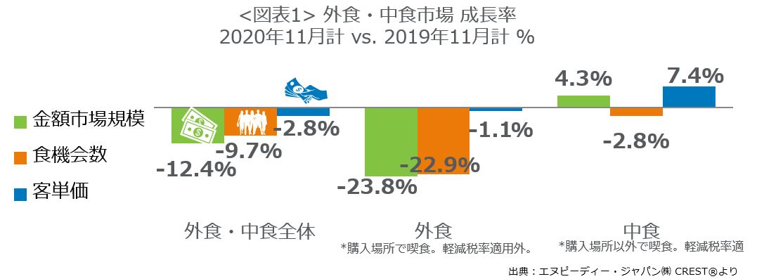 <外食・中食 調査レポート>2020年11月の市場動向、外食・中食売上は12.4%減、感染拡大第3波で回復後退、出前は68%増