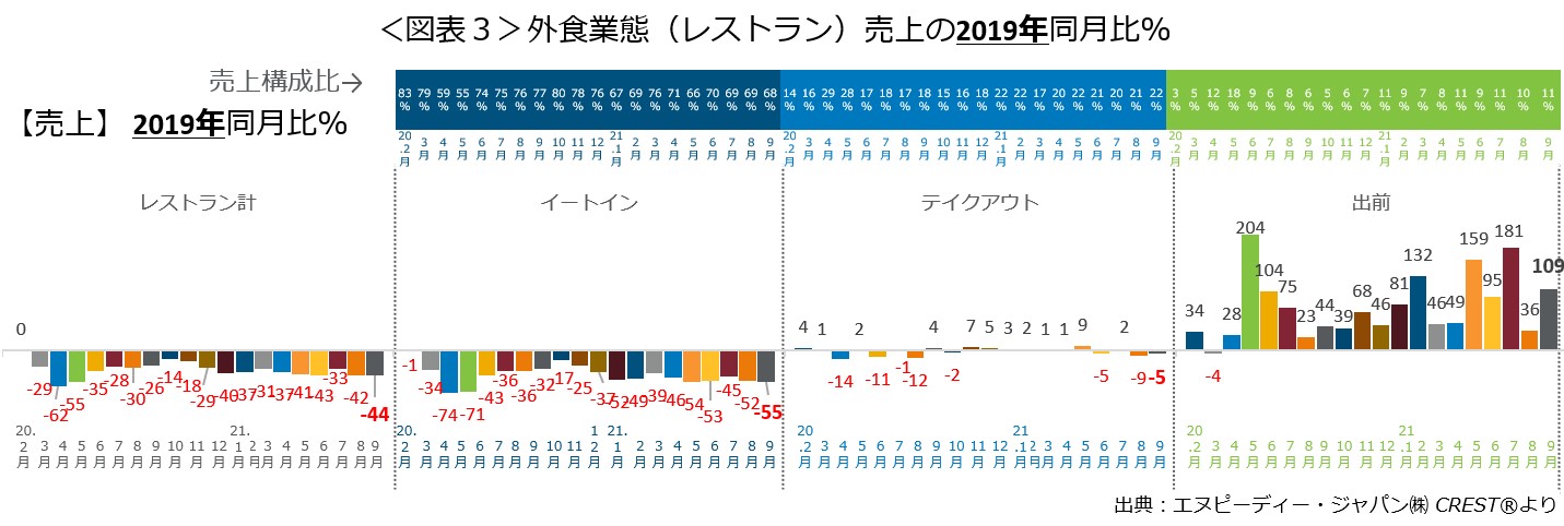 業態別・利用形態別の9月の売上2019年同月比をみると(図表2)、外食・中食全体のイートインは53.2%減で、前月より3.0ポイント減でした。業態別では、FF+セルフカフェのイートインは同39%減、ファミレスのイートインは同47%減、居酒屋のイートインは同92%減、その他のフルサービスレストランのイートインは同53%減でした。テイクアウト・出前は、FF+セルフカフェで同53%増と19カ月連続のプラス成長で、前月よりも12.6ポイント増でした。