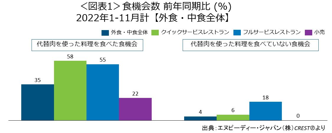 外食・中食の代替肉食機会数、2022年1-11月期に35%増