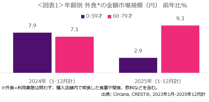 外食(購入した店舗内での喫食)における60-79才の金額市場規模は、2024年(1-12月計)は、前年比で7.1%増、2025年(1-12月計)は同9.3%増となりました。一方、0-59才では、2024年は同7.9%増と60-79才をやや上回る成長を示したものの、2025年は同2.9%増にとどまりました。2025年は、60-79才が0-59才と比べて3倍以上の伸び率となっていることが分かります。