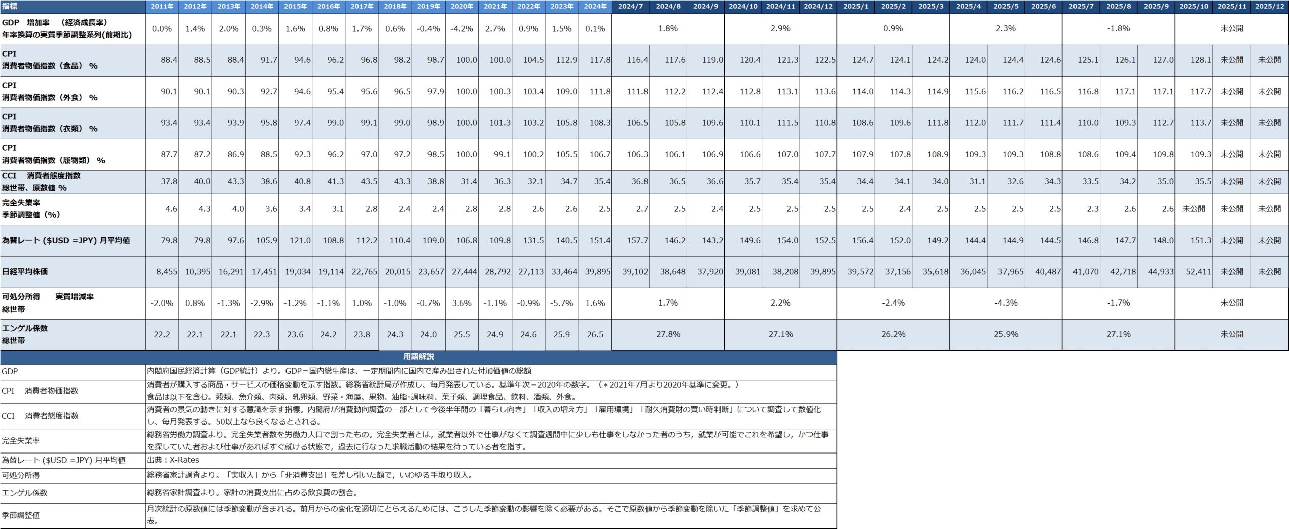日本の各種経済指標と、世界のCCI(消費者態度指数)をまとめたページです。