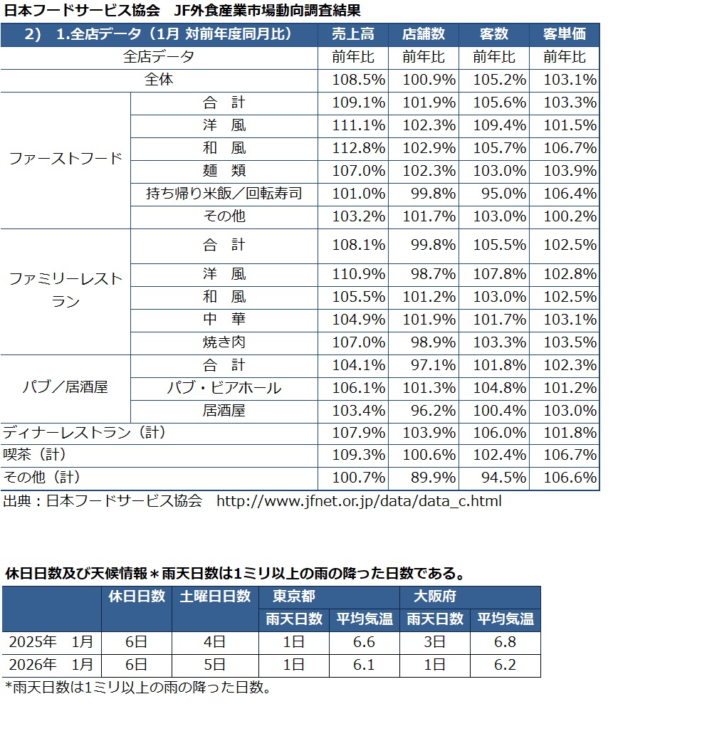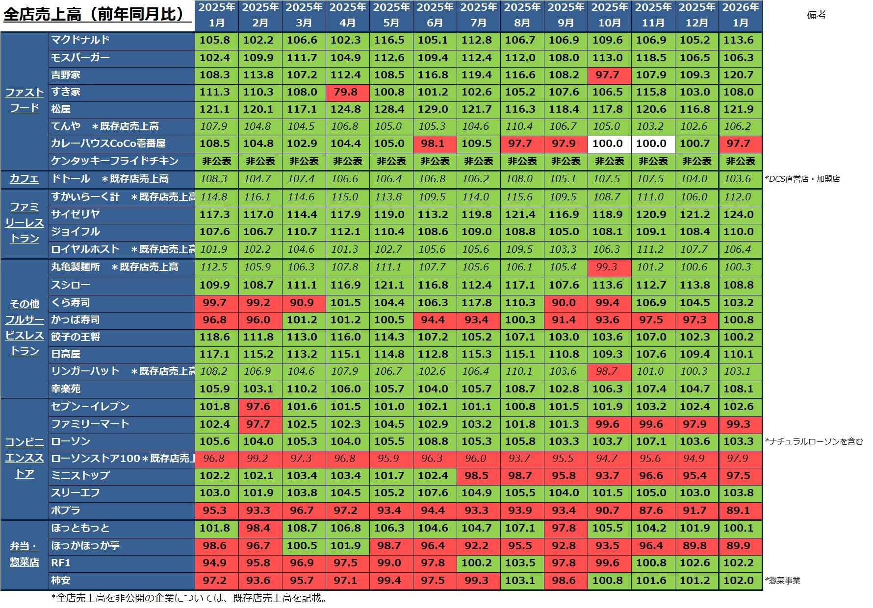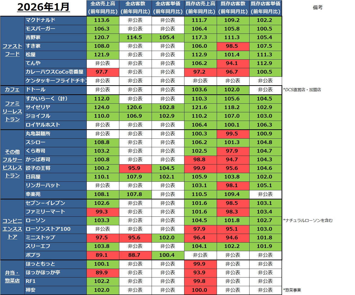 2026年1月の各社・各業態売上情報、マクロ経済指標